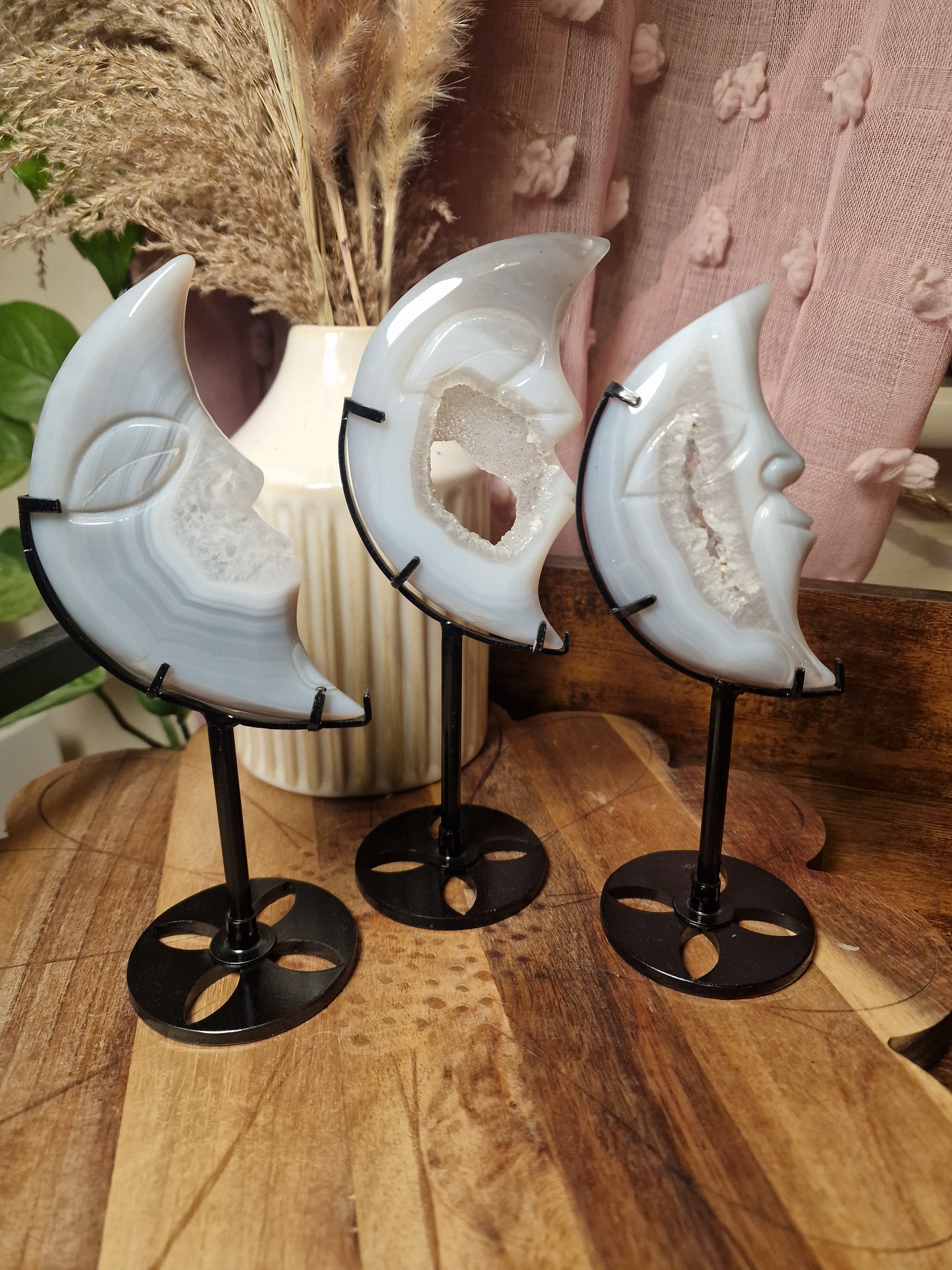 A softly carved agate moon, each one holding its own natural druzy pocket, a quiet shimmer revealed within smooth, banded stone.