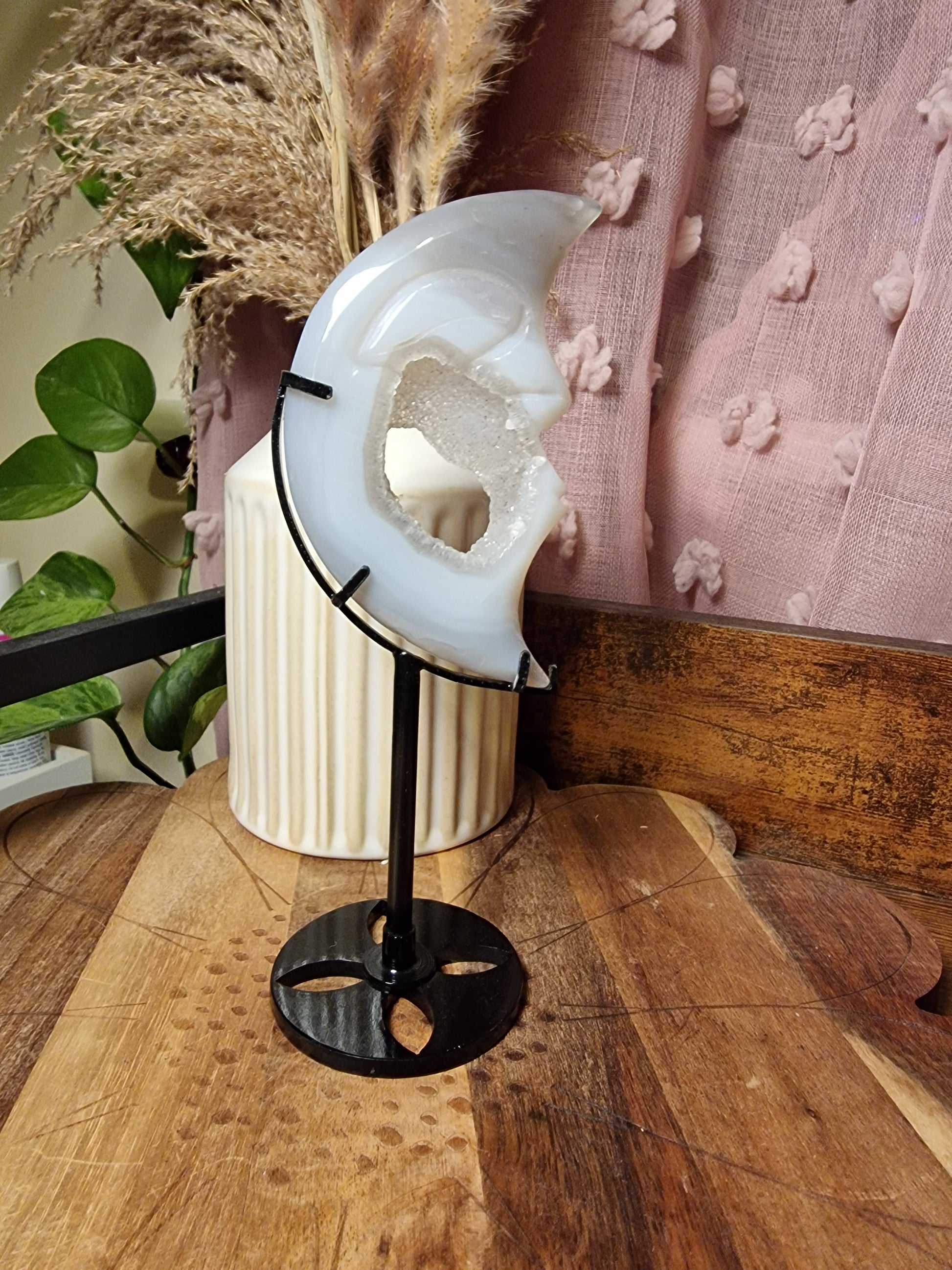 Mounted on a simple metal stand, these moons are made to rest on altars, shelves, desks, or anywhere that calls for a moment of stillness and reflection. No two are the same; each carries its own markings, patterns, and inner sparkle.