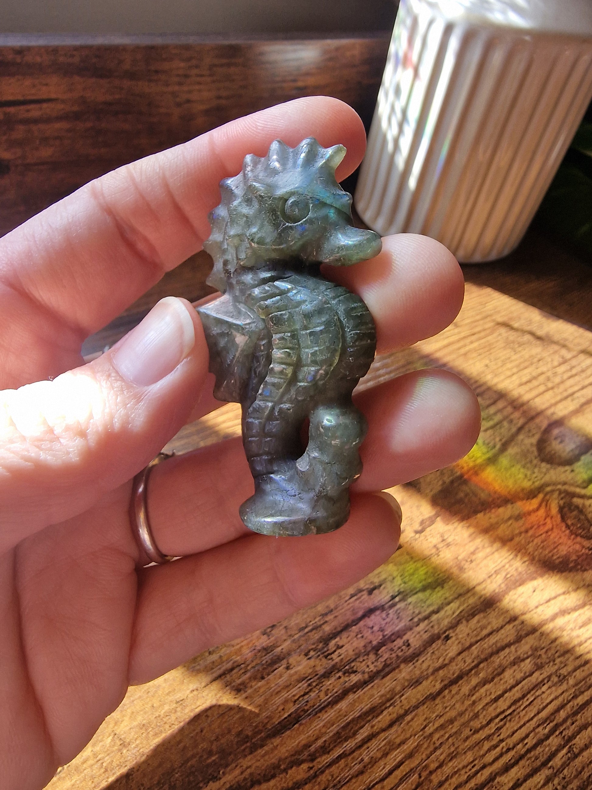 Carved from shimmering labradorite, each seahorse catches the light with hidden flashes, a reminder of protection, mystery, and the quiet strength of the ocean.