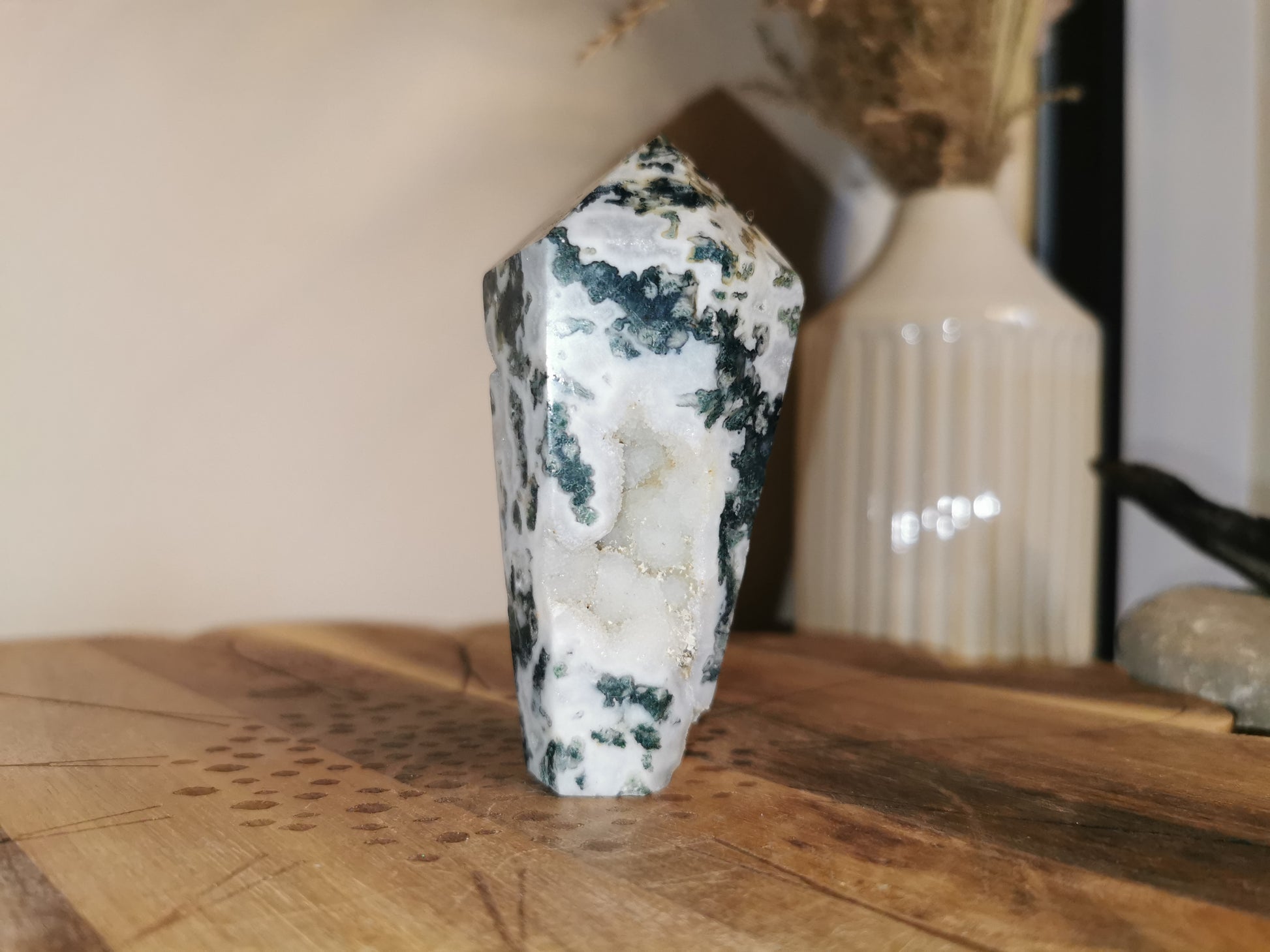 Nature’s fingerprint, carved in stone. These Moss Agate towers each carry their own unique landscape of earthy greens, cloudy whites, and forest-like inclusions, like miniature worlds captured in crystal. Grounding, gentle, and deeply connected to the energy of growth.