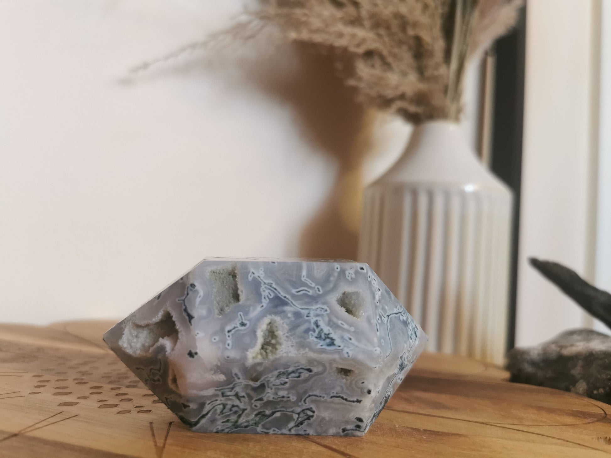 These beautiful Moss Agate double terminated points carry the spirit of nature within stone. Each piece features unique swirling mossy patterns, with shades of green flowing through soft white. Available in two sizes, equally special, just a little different in presence. Choose the one that calls to you