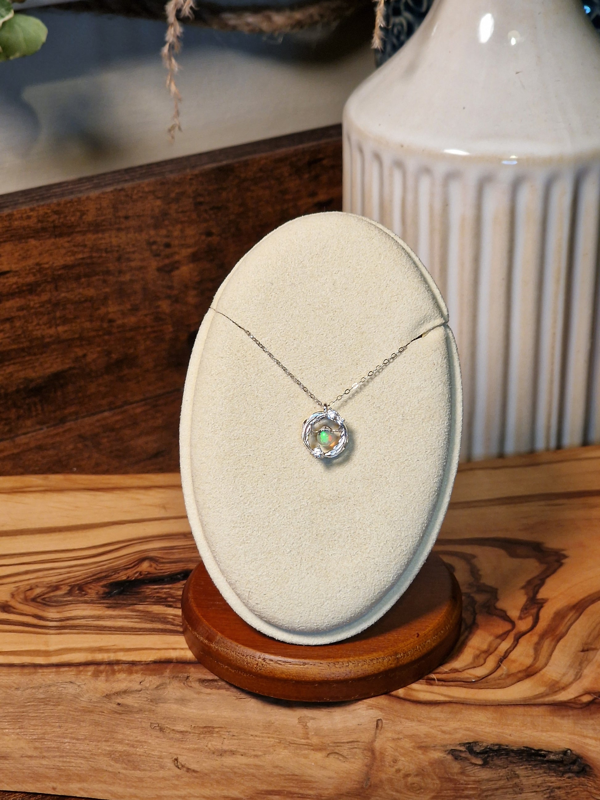 Like a captured drop of light, this opal pendant shimmers with shifting colour and quiet elegance. Set within a 925 silver frame that gently spins, it catches and reflects the glow around it, a dance of rainbow hues in every turn.