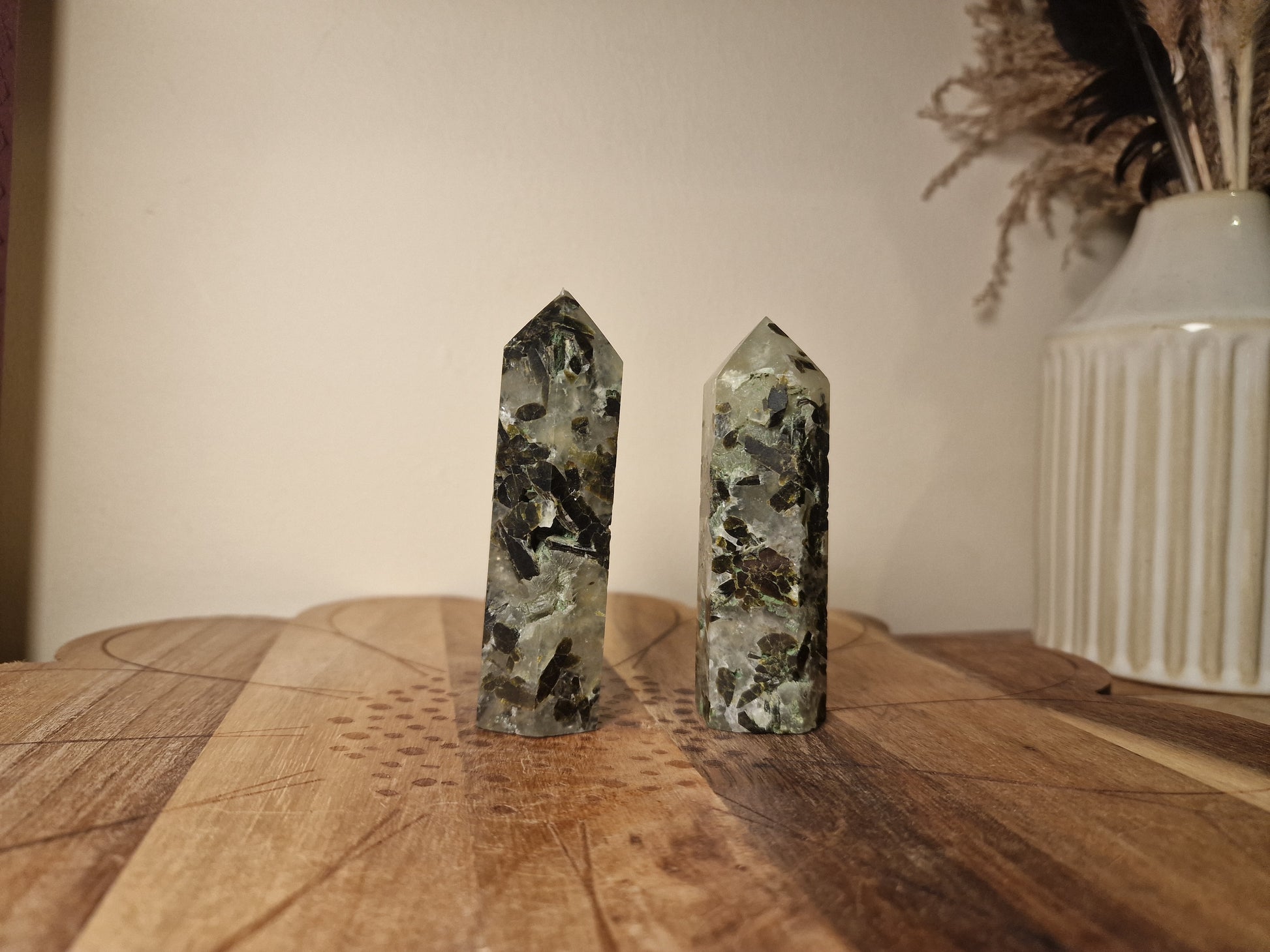 Beautiful Prehnite points, each one carrying its own earthy character, some polished smooth, others with natural raw edges and exposed tourmaline. These details make every piece completely unique, like little crystals grown wild in the forest.