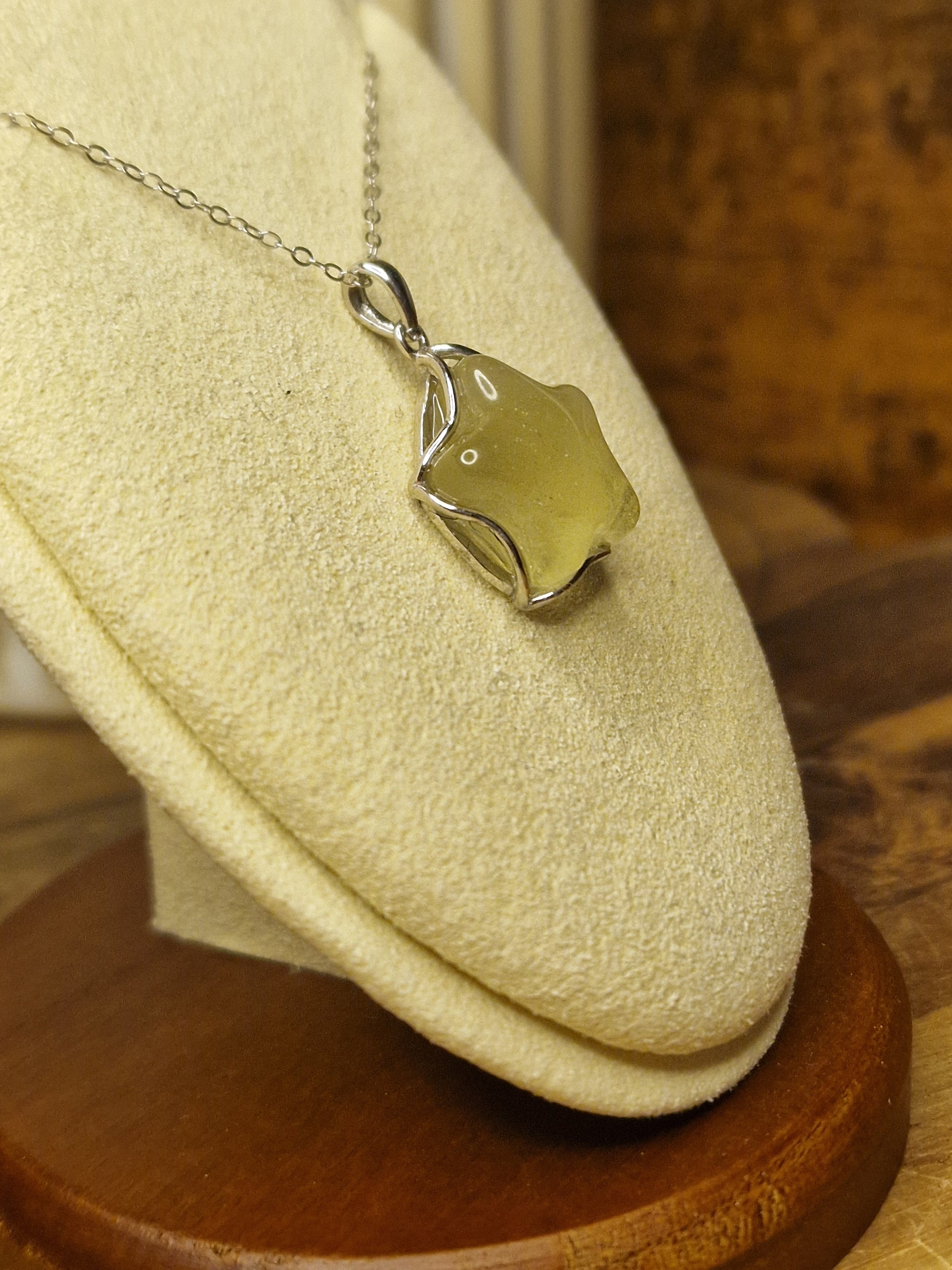 Shaped into a delicate star and framed in 925 silver, this pendant holds a piece of genuine Libyan Desert Glass, a rare and ancient tektite formed in the Sahar around 29 million years ago. Its soft golden hue glows with a warm, otherworldly energy, making it a truly special addition to any jewellery collection.